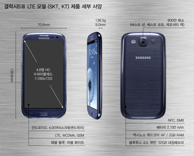 Южнокорейская компания Samsung Electronics анонсировала на своем домашнем рынке весьма любопытную модификацию нового флагманского Android-смартфона Samsung Galaxy S III, сочетающую поддержку сетей четвертого поколения LTE и фирменныйчетырехъядерный процессор Exynos с тактовой частотой 1,4 ГГц, обеспечивающий мобильному устройству отличную производительность. Напомним, что в США версия Samsung Galaxy S III с LTE обходится двухъядерным чипом Qualcomm Snapdragon S4.