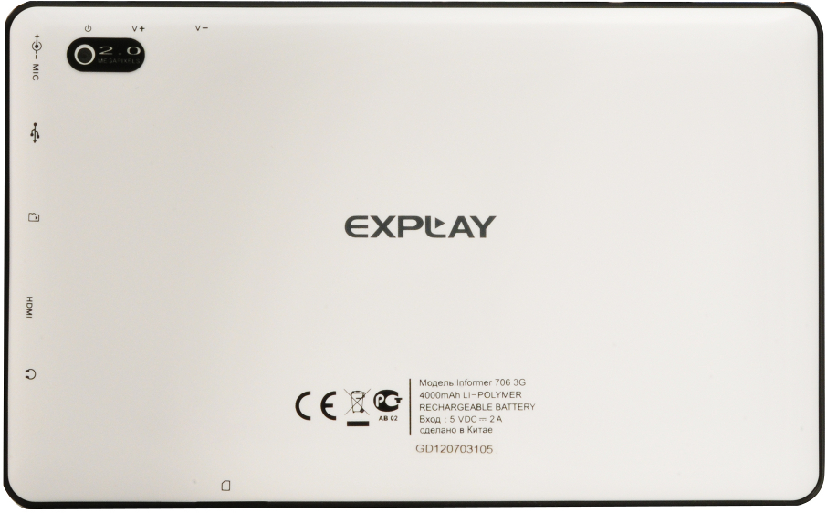 Планшет выполнен в тонком классическом корпусе с белой задней крышкой. Он оборудован 7-дюймовым экраном с разрешением 800х480 пикселей. Informer 706 3G работает на базе операционной системы Android 4.0. Производительность планшета Explay обеспечивает процессор RockChip A10.
