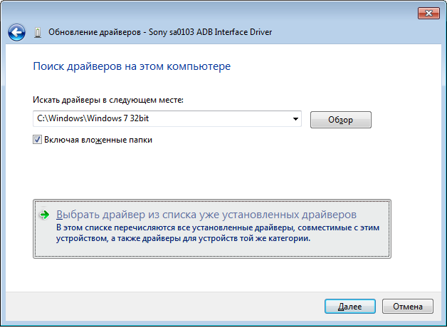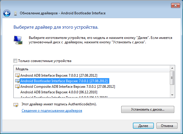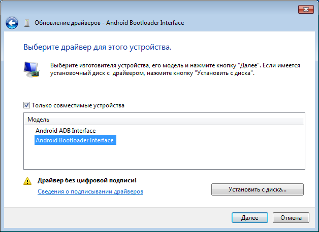Если смартфон при таком подключении очень быстро переходит в режим подзарядки и светодиод меняет цвет с синего на зелёный, то вы вряд ли успеете вручную установить драйвера. В некоторых случаях помогает такой финт: отключаем смартфон от ПК, в меню диспетчера устройств выбираем «Действие» → «Установить старое устройство» и в открывшемся мастере выбираем ручную установку драйвера. Далее, как описано выше, добираемся до папки с драйверами и принудительно инсталлируем Android Bootloader Interface (4.0.0.0). Подключаем телефон в fastboot-режиме, он определится как Android ADB Interface. А вот теперь по накатанному пути обновляем для него драйвера, но снимаем галочку «Только совместимые устройства» и ставим Android Bootloader Interface (7.0.0.1).