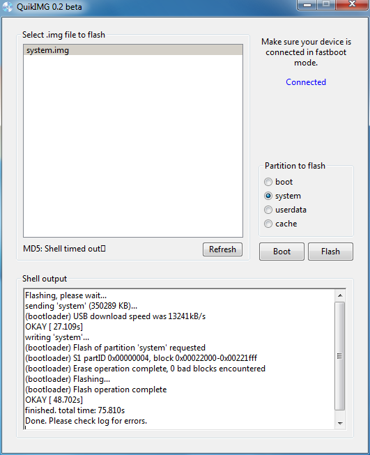 Телефон пока не отключаем. Прошивка устанавливается с помощью утилиты QuikIMG. В подкаталог images необходимо скопировать img-образ системы из архива с prerooted-прошивкой и ничего более. Не перепутайте — не zip-архив, а именно файл img (например, system.img)! Запускаем QuikIMG, в списке слева выбираем извлечённый img-файл, справа отмечаем system и нажимаем кнопку Flash. Через пару минут телефон прошьётся и его можно будет отсоединить от ПК, перезагрузить и провести базовую настройку системы. Проверяем, что у нас действительно установлена версия 2.3.7 и включаем режим отладки в настройках приложений.