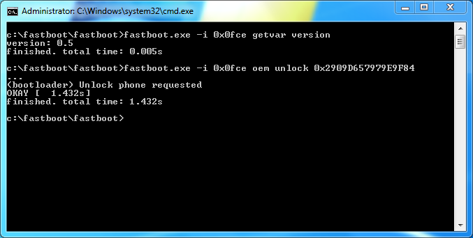 | fastboot.exe -i 0x0fce oem unlock 0xKEY |